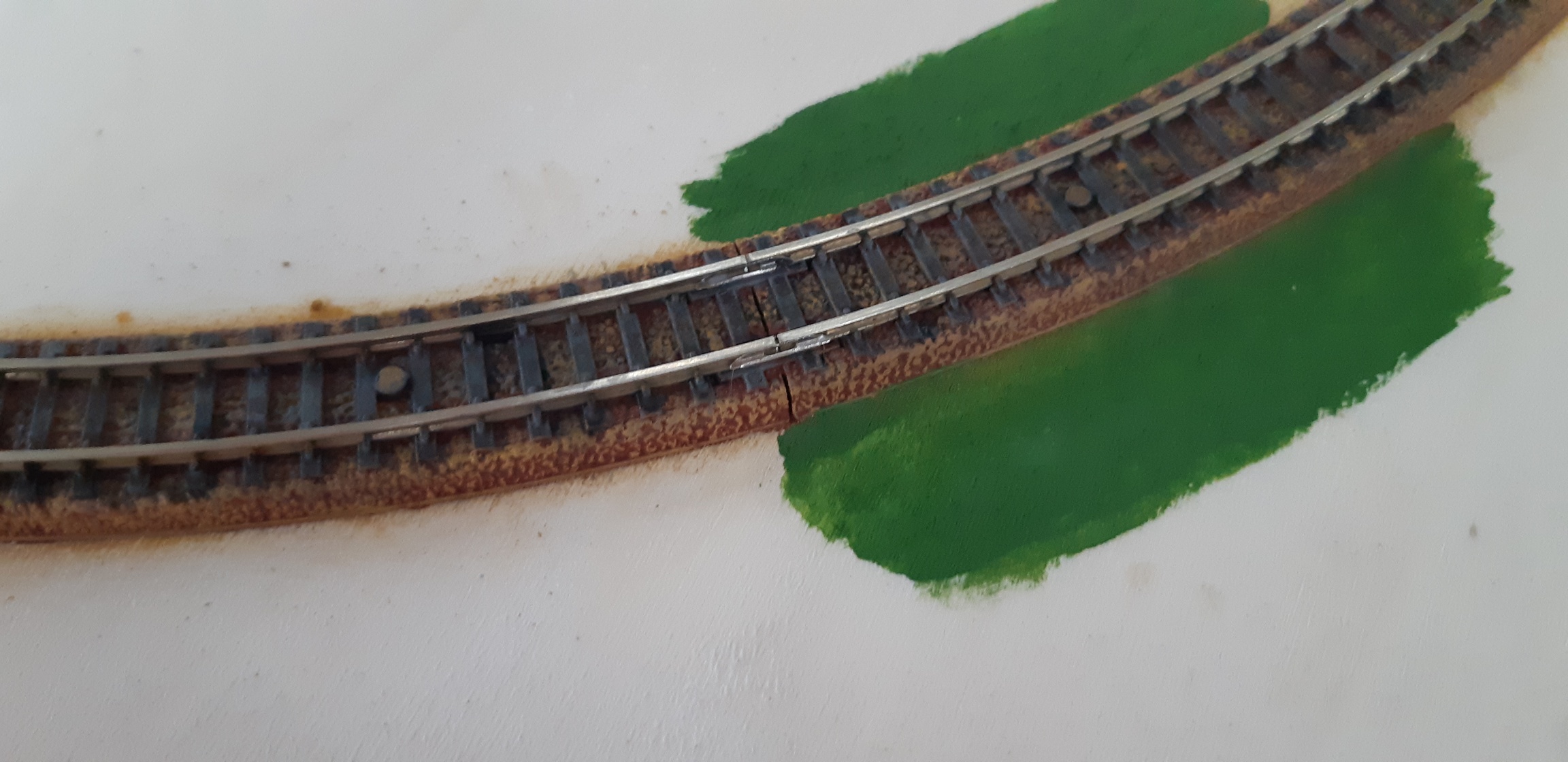 Riguardo all'invecchiamento dei binari, in effetti il secondo tentativo sembra più convincente. E concordo con te: forse non farei la sporcatura centrale... Anche perché sei sempre in tempo a rimediare in un secondo momento!