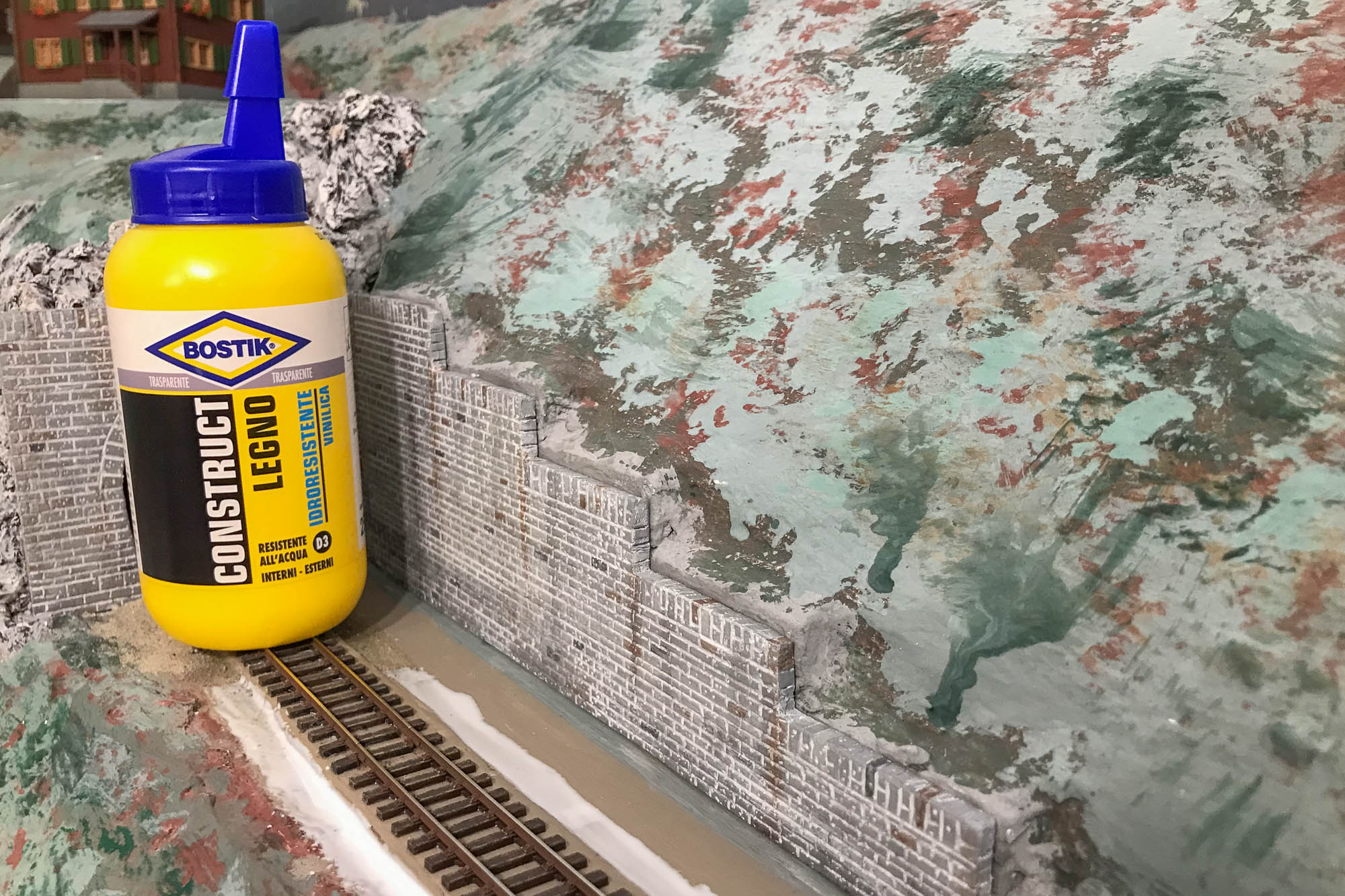 A colla asciutta (24 ore dopo) ho dato una passata di vernice color ruggine con l’aerografo solo vicino alle rotaie.