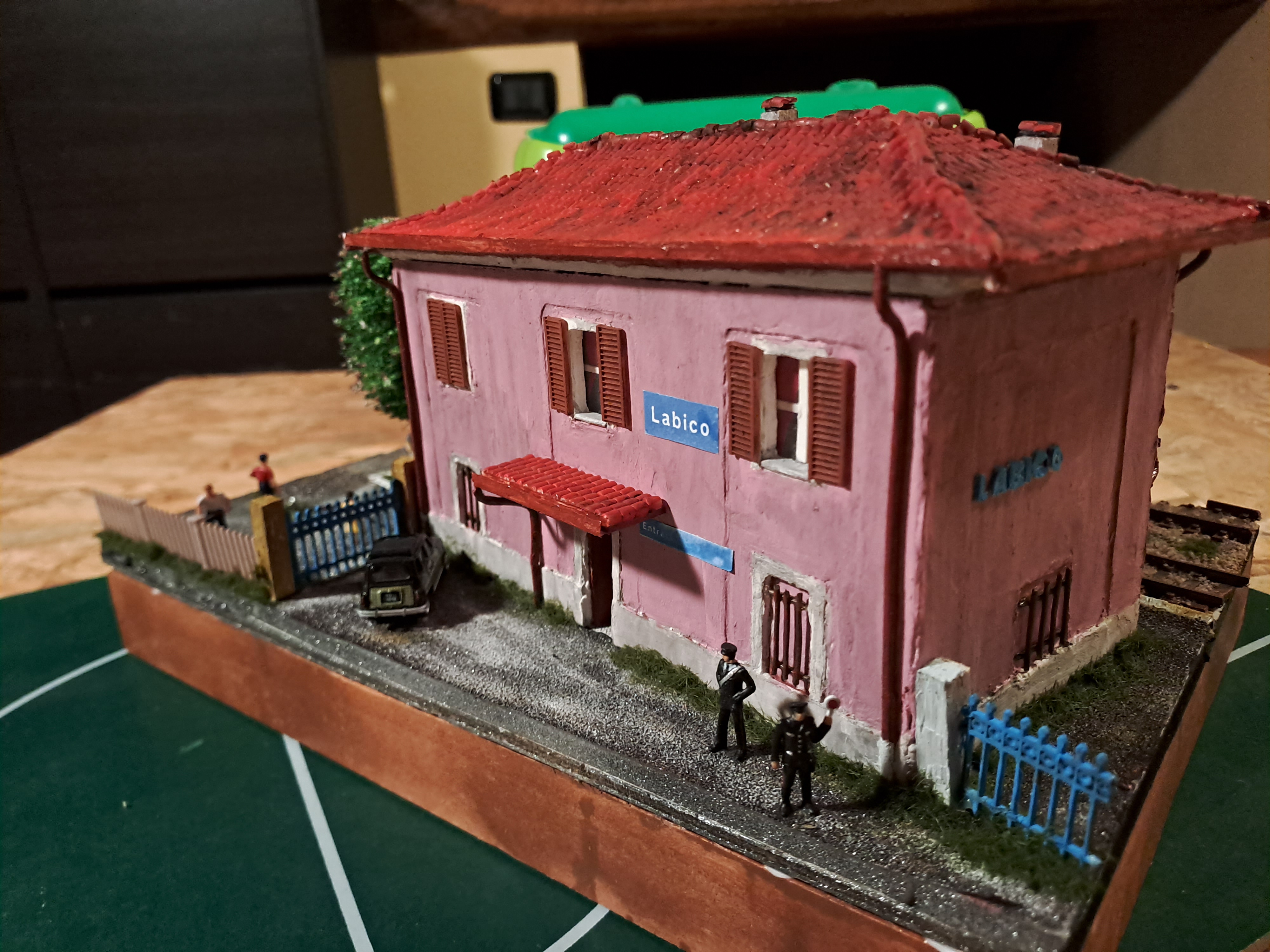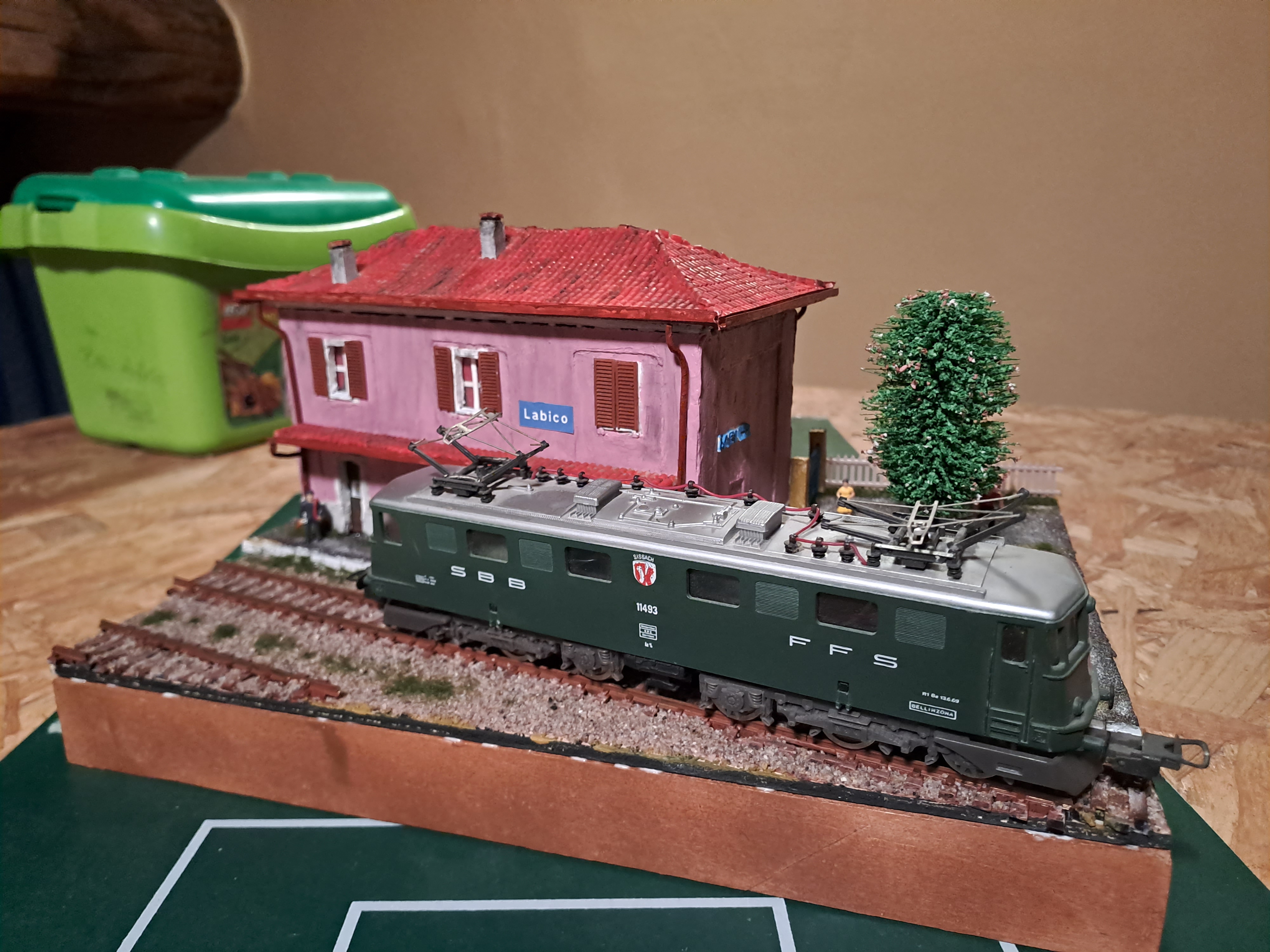 Per esporre le loco che mi sono rimaste, insieme a mio figlio di 14 anni abbiamo fatto questo piccolo diorama da esposizione cercando di riprodurre, senza pretese, la stazione di Labico, il paese che ci ospita. Fatto con materiali poveri, cartoncino e pasta per le tegole ... quest'ultima un'idea di mio figlio