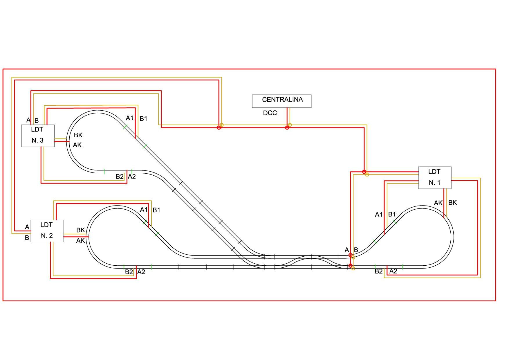 come anticipato pubblicherò di seguito una rappresentazione schematica del mio plastico con i moduli di inversione della polarità della LDT, con i vecchi cablaggi e con i nuovi.