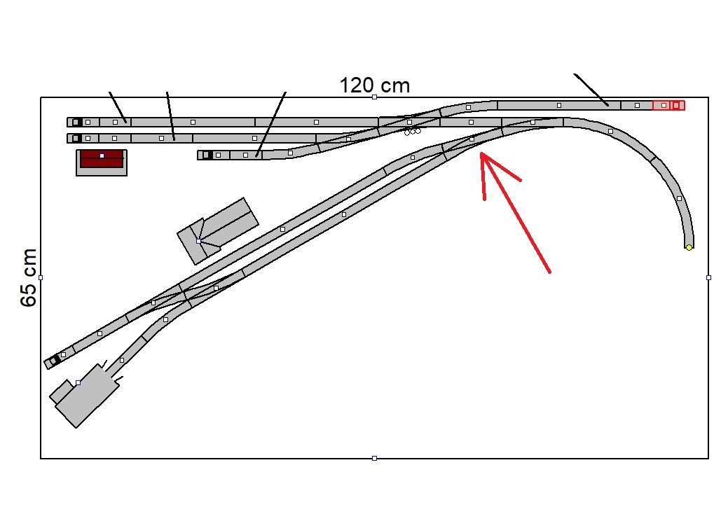Almeno guadagna qualche altro centimetro cambiando il deviatoio di sdoppiamento del binario (usa un deviatoio sinistro invece che uno destro preceduto dalla mezza curva) indicato dalla freccia rossa.