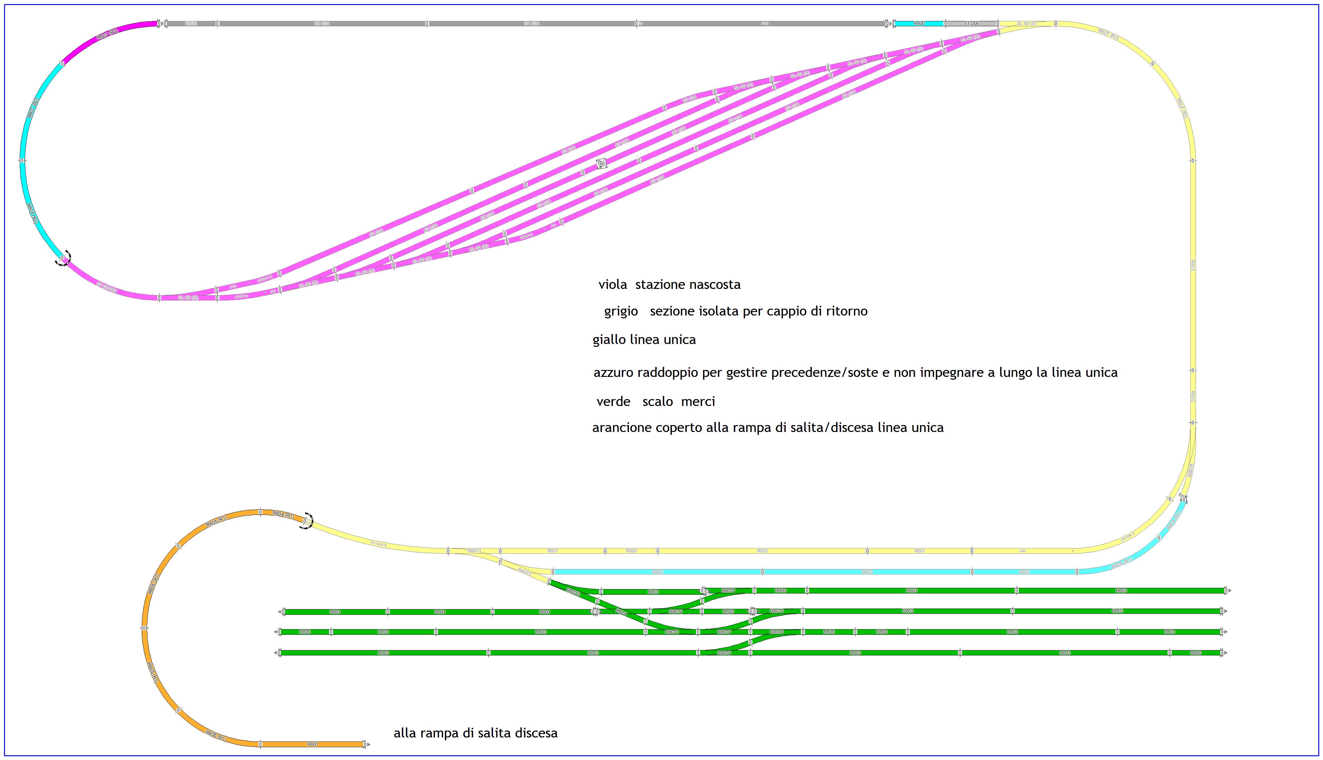 Meglio allora sarebbe lasciare la stazione nascosta com'è, senza cappio, ma creare una doppia comunicazione nell'angolo dx al piano superiore, in modo da poter scegliere in quale direzione percorrere la stazione principale. E permettere così una circolazione legale sul resto del tracciato, anche per i convogli in uscita dalla stazione principale stessa. Così facendo si crea nuovamente un cappio ma, a mio avviso, più funzionale.