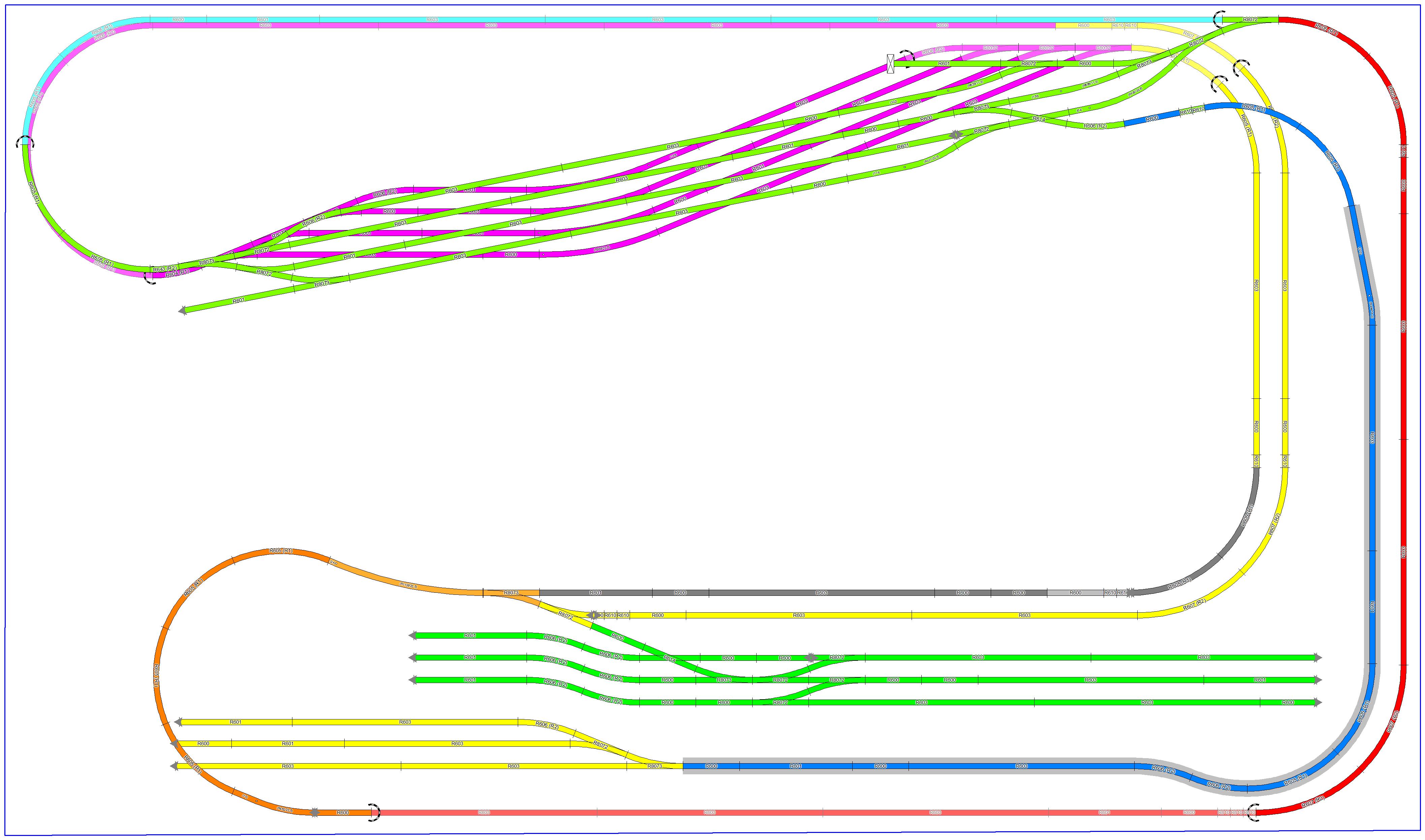 -Stazione nascosta: dovrebbe avere almeno 3 binari di sosta (abbastanza lunghi da contenere il convoglio più lungo circolante) e 1 di corsa libera. Non dovrebbe presentare deviatoi tripli o incroci e, anzi, dovrebbe avere deviatoi lunghi, in modo da minimizzare i rischi di svio dei rotabili evitando curve e controcurve strette. Sarebbe preferibile che fosse percorsa in un'unica direzione di marcia, tanto più se in forma di cappio da linea singola, in modo da semplificare itinerari e sequenze e controllo da parte dell'operatore. Meglio se i binari di sosta sono posti verso il centro della stanza (come nell'ultimo tracciato di Piero) piuttosto che verso il muro, così da poter meglio raggiungere i rotabili in caso di bisogno. Prevedere un'apertura inferiore nella strutta, specie presso la curva in alto a sinistra, per raggiungere i binari lungo la parete.