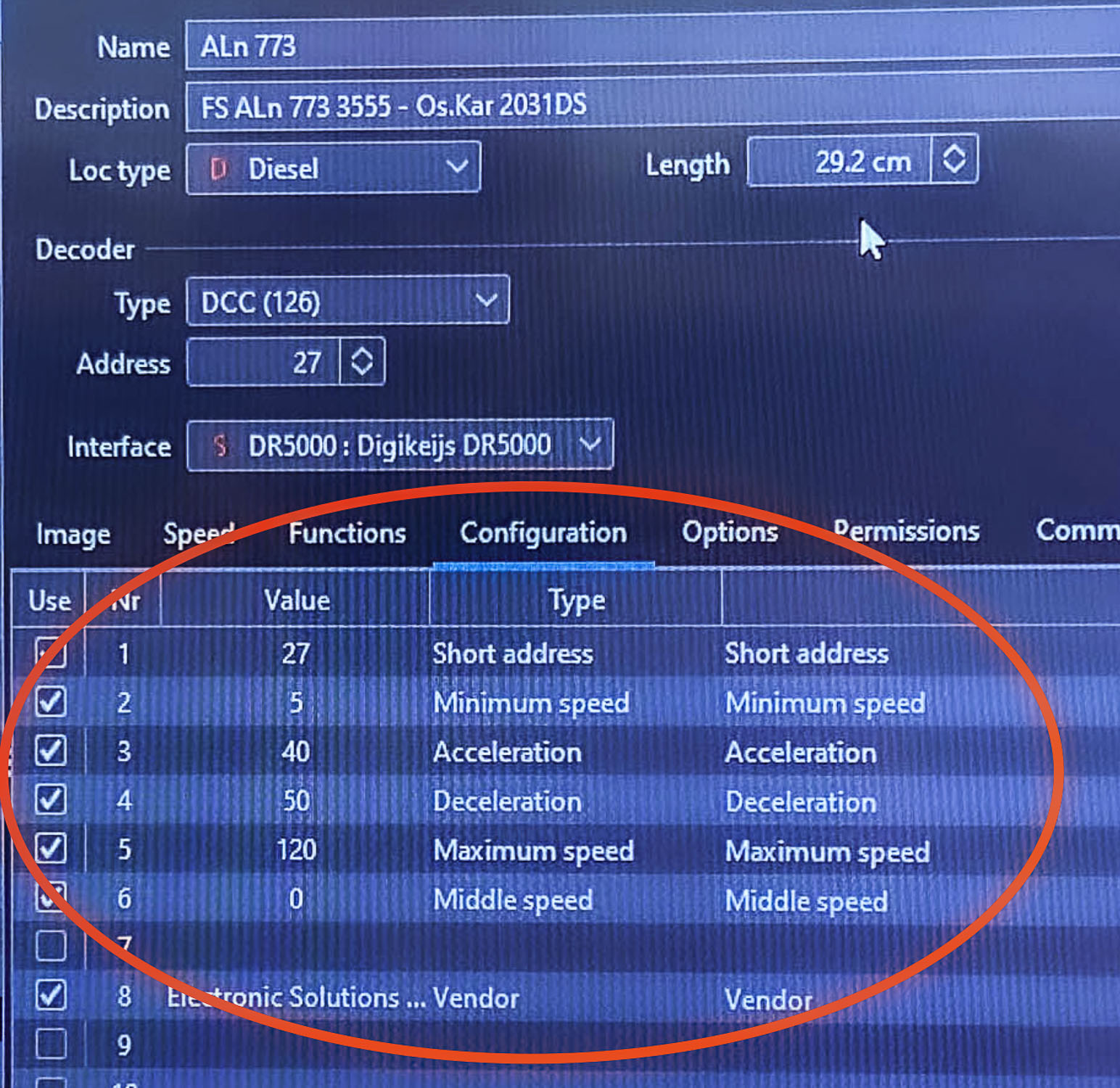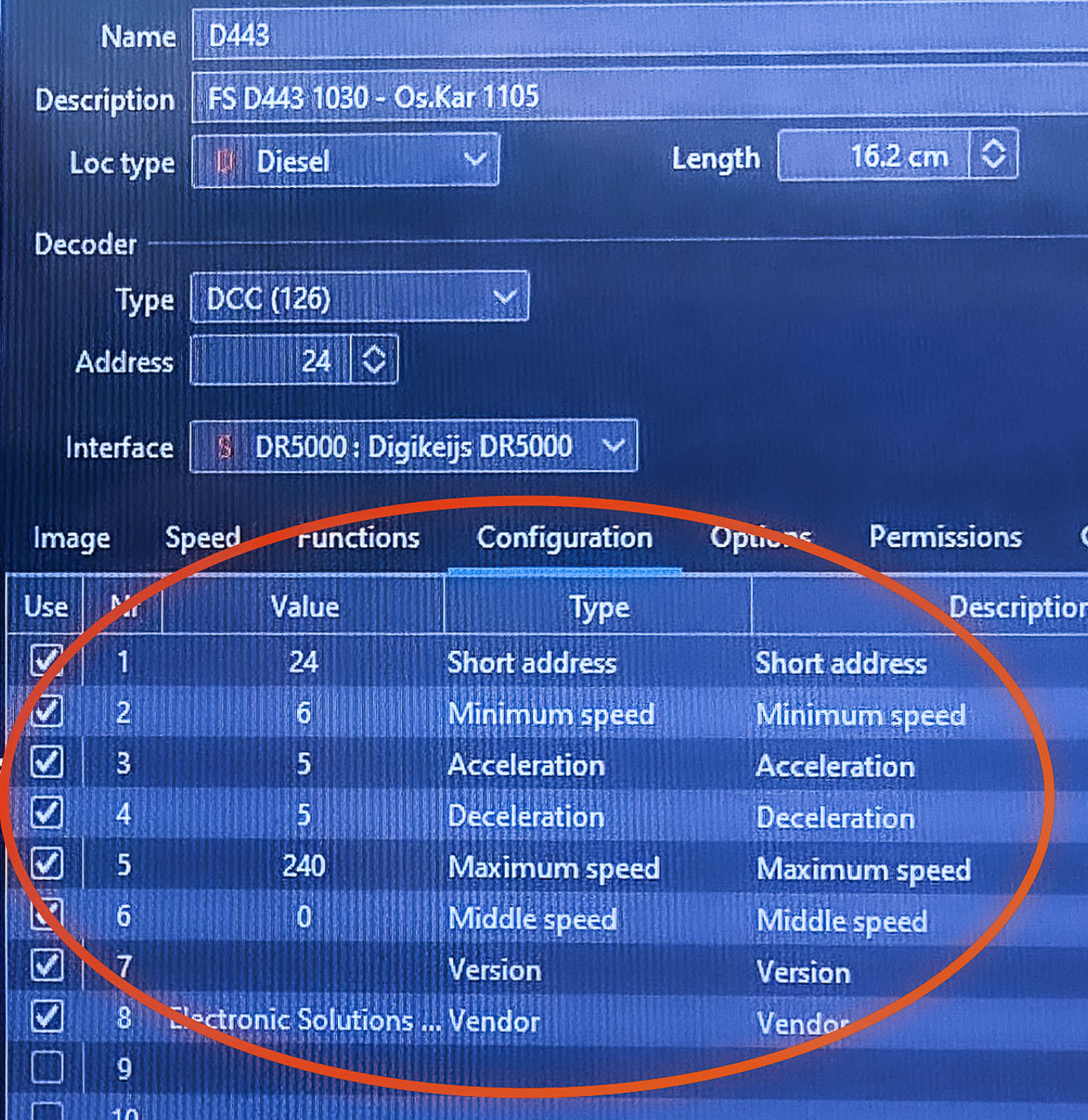 Invece la D443 (sempre di Oskar e sempre con decoder ESU) di default aveva valore della CV 5 pari a 120 che produceva solo 65 km/h di velocità massima.