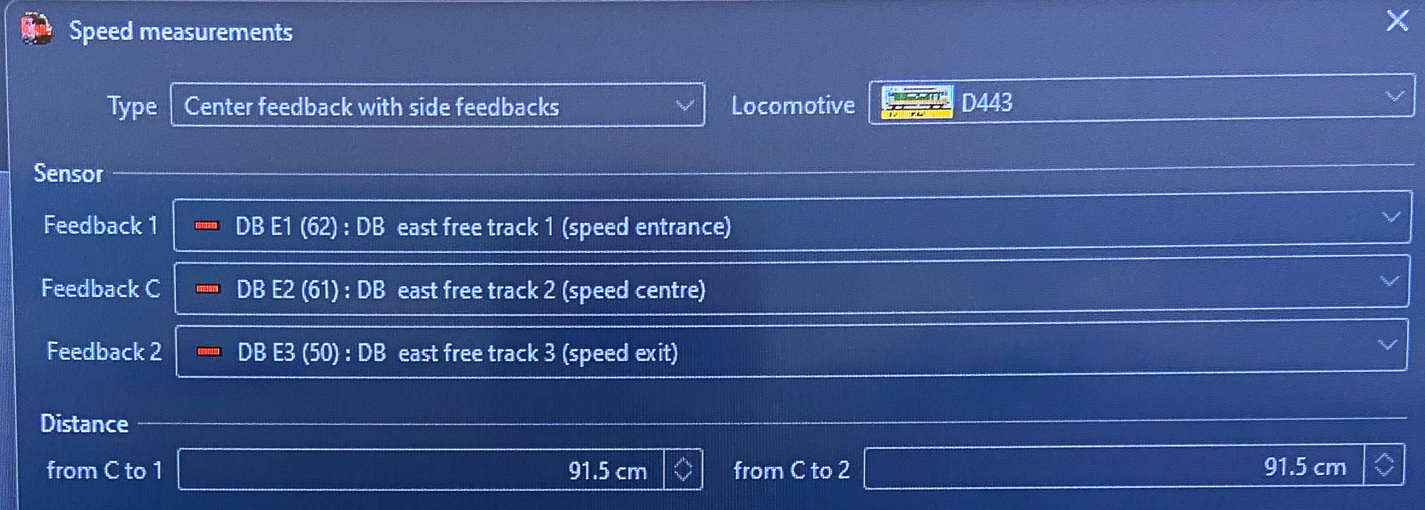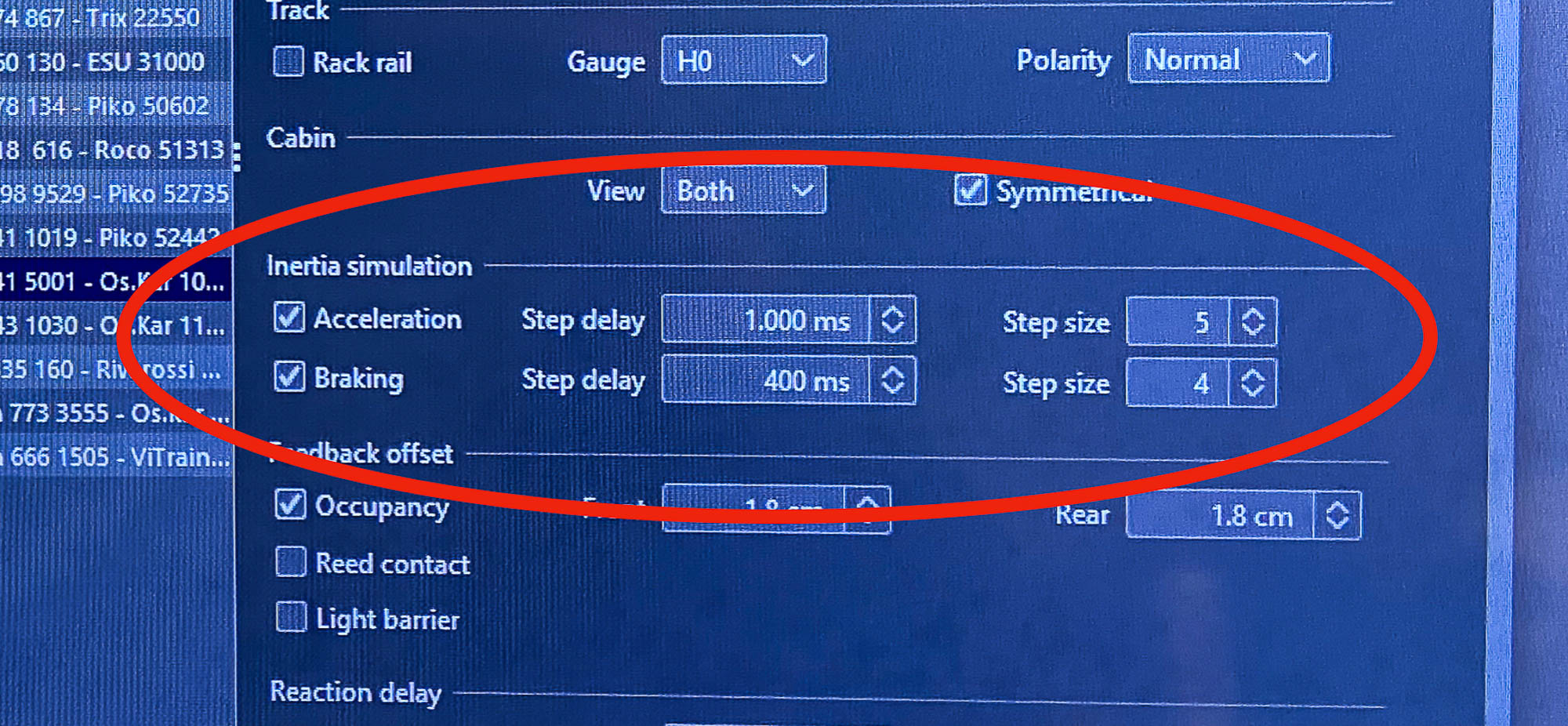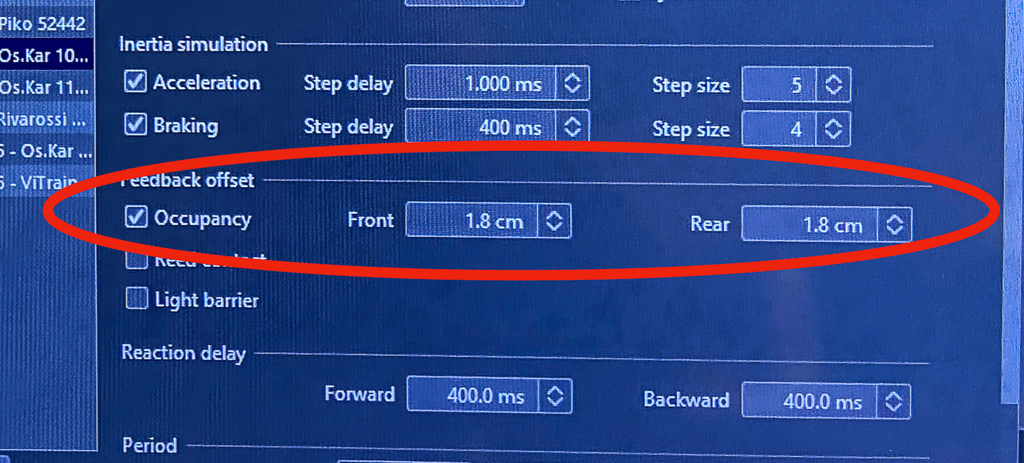 c) inserire la misura della distanza tra i respingenti e il primo punto di contatto (denominato dal programma “feedback offset”, nella pagina opzioni del menù locomotiva - foto 4) …