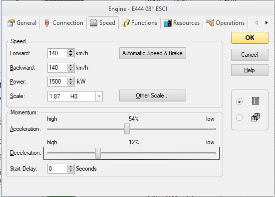 4) nella pagina opzioni del menù locomotiva impostare due valori di simulazione dell’inerzia tale da ottenere che partenza e arresto abbiano una dolcezza realistica (foto