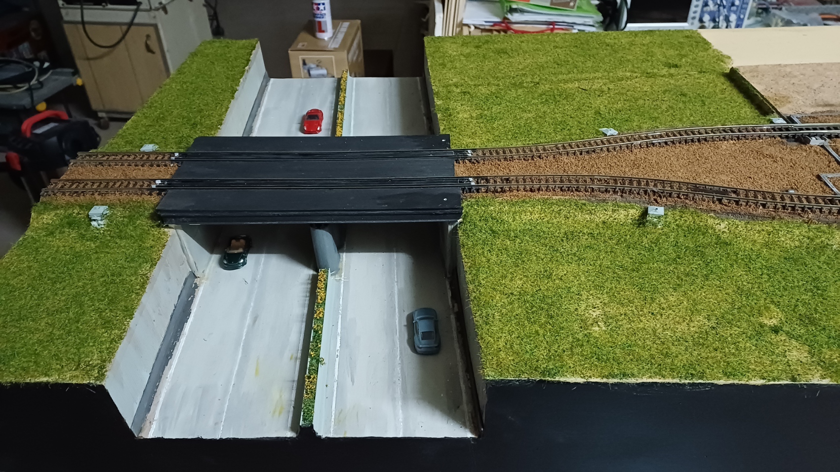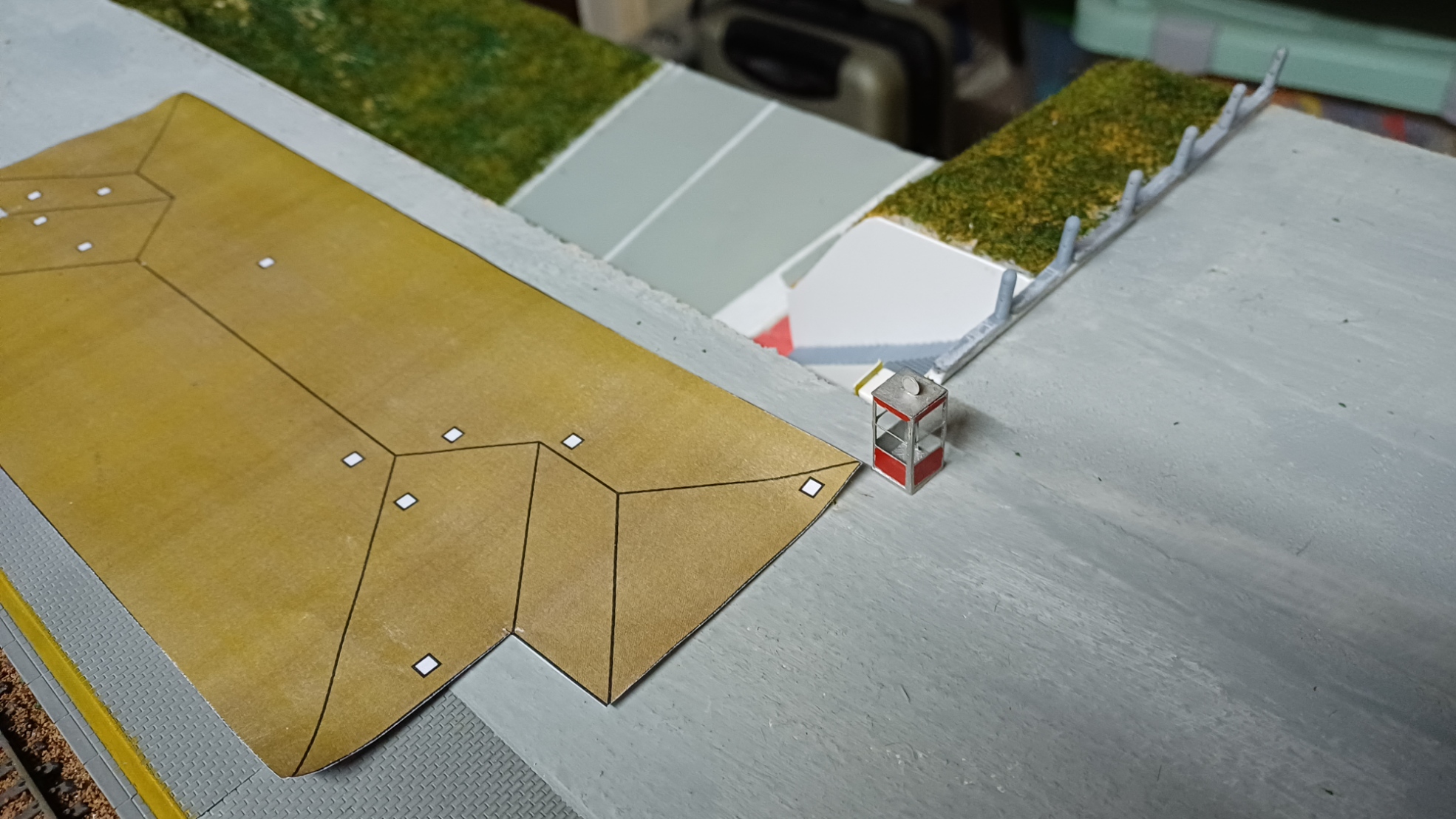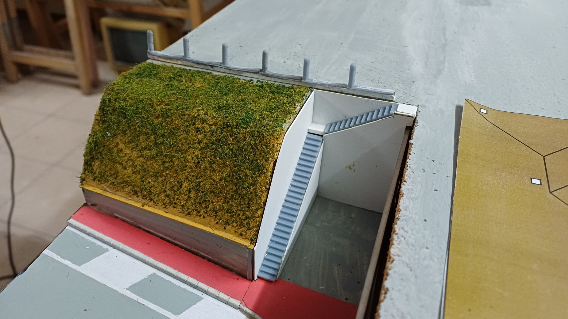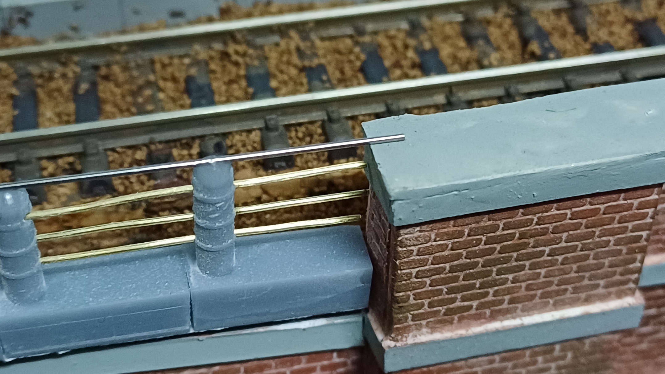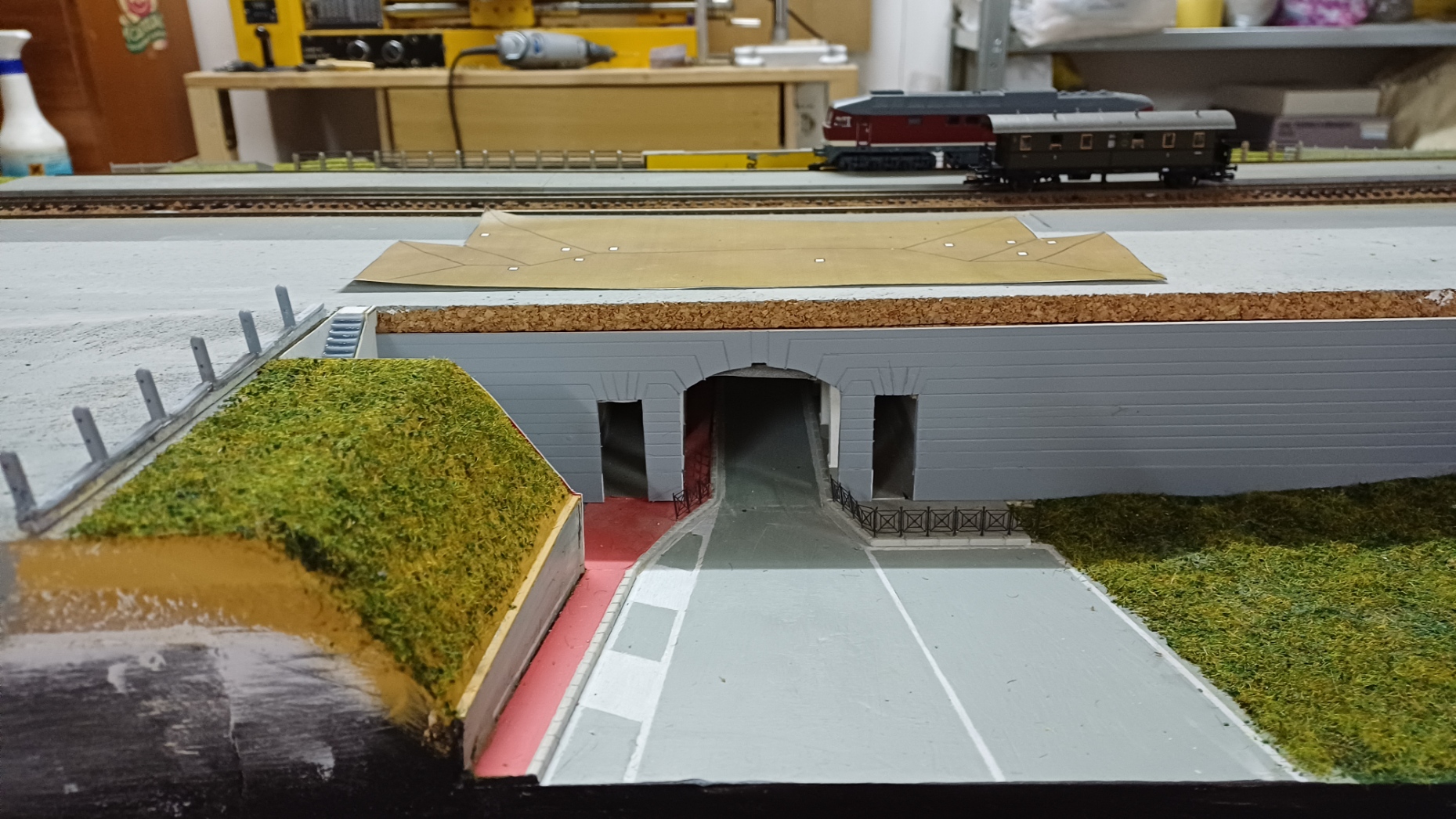 Il parapetto sopra il tunnel automobilistico di uscita dalla città di Desio è realizzato con pali tondi in cemento attraversati da profili in ferro. Per realizzarli, ho stampato in resina i singoli pali con una base in modo tale da unirli incollandoli su di un sempice foglio di carta. Sono 13 pali sul lato destro e 19 su quello sinistro del portale.