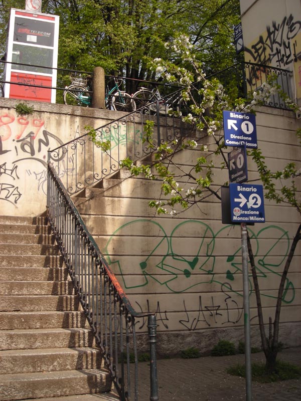 Verso il lato operatore, il portale del sottopasso ha delle scale pedonali che consentono ai viaggiatori di portarsi sul binario 2. C'è una cabina telefonica, una staccionata a pilastrini e una ringhiera un po' particolare.