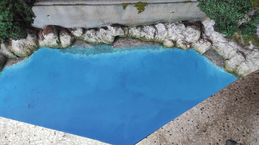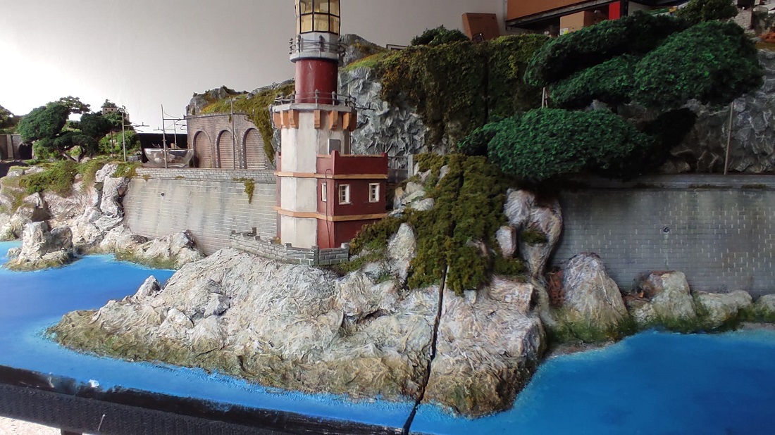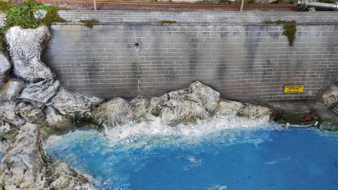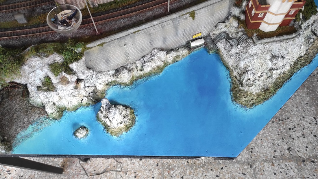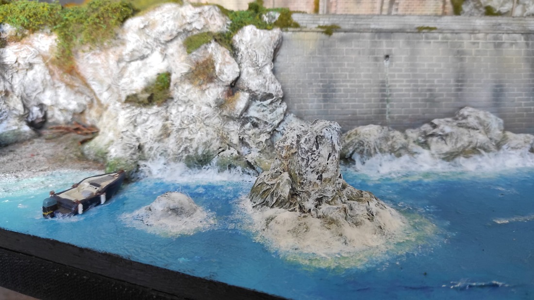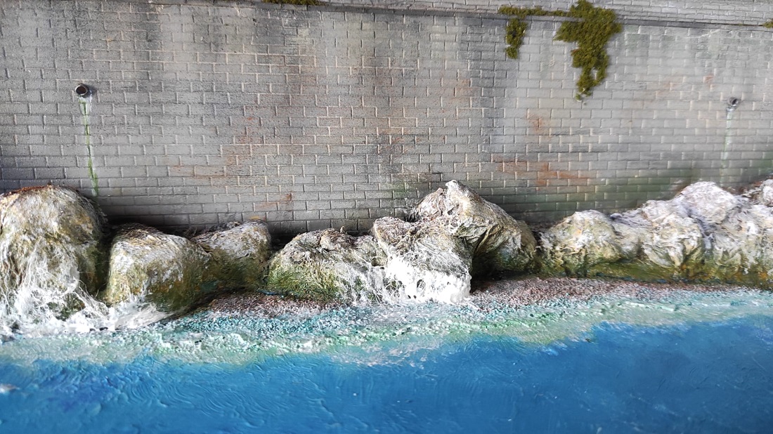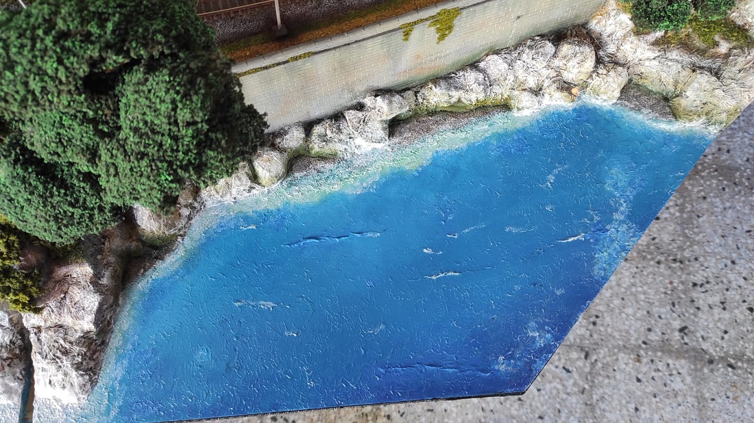 Il primo step è terminato. Il mare antistante alla ferrovia ora è più realistico, ormai l'opaco silicone ha lasciato spazio ai più moderni gel effetto acqua. Anche la nuova colorazione ha provveduto a migliorare l'effetto del mare. Sono riuscito anche ad ottenere l'effetto delle onde che si infrangono sugli scogli. Lascio qualche immagine.