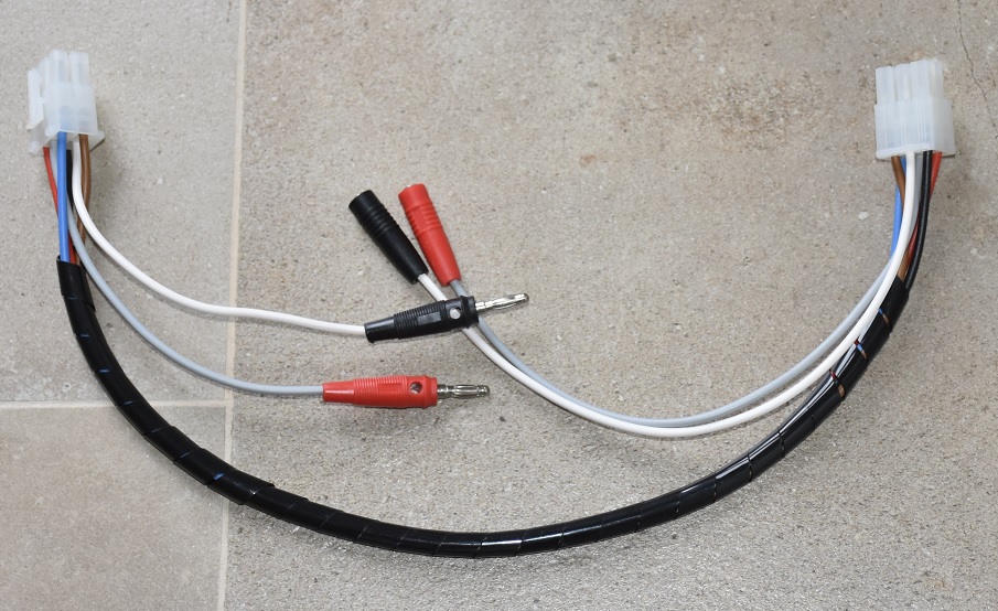 Sono previste briglie con fili sciolti per un uso personale durante la costruzione e le prove elettriche del modulo. Sono previste briglie con possibilità di variare la polarità dei binari quando qualche modulo viene montato in modo inverso rispetto all'orientamento di base, giusto per evitare cortocircuiti sui binari passando da un modulo all'altro (in questa foto sono presenti le banane solo sui fili bianco e grigio, mancano sul rosso e nero).