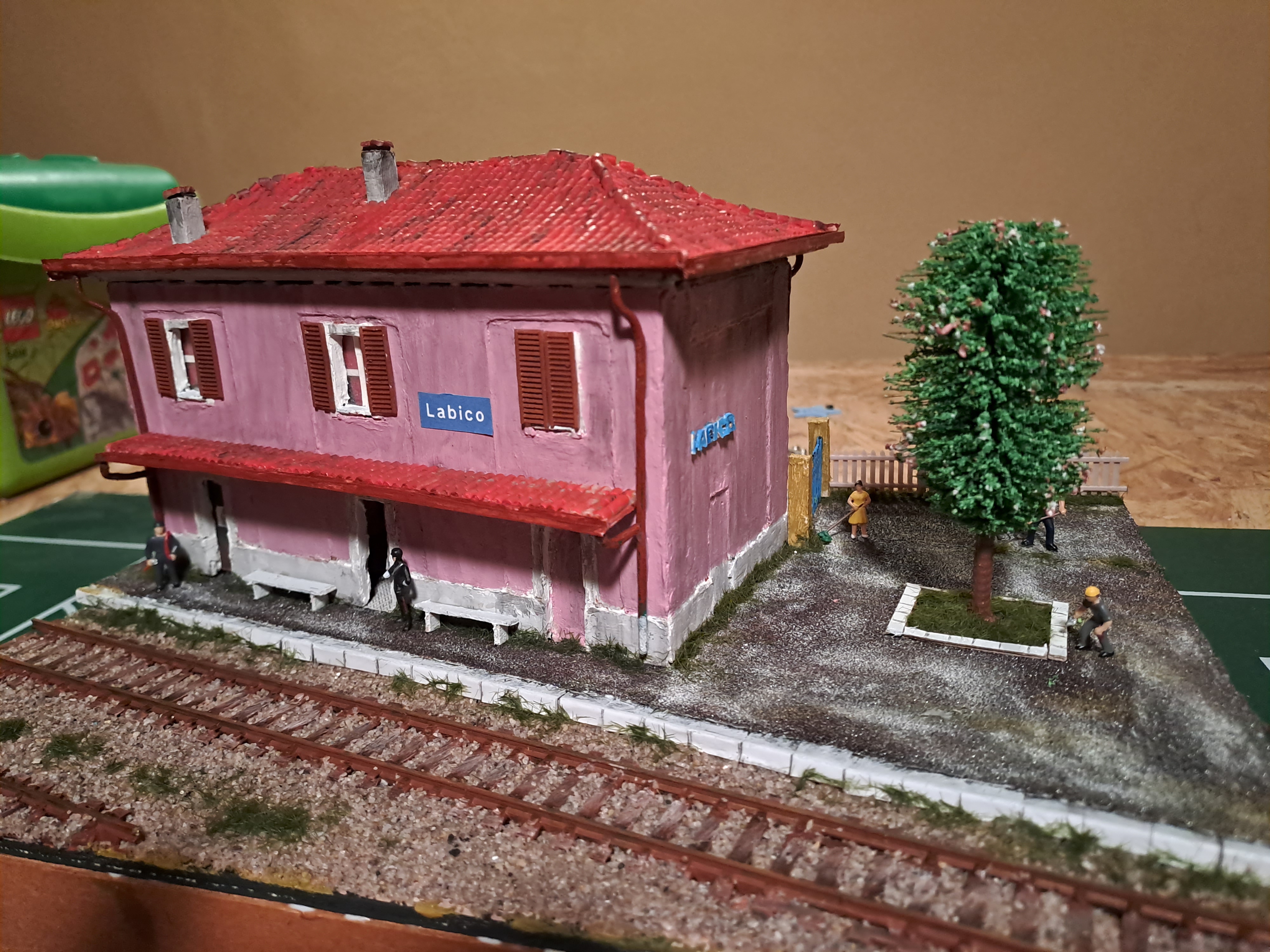 Per esporre le loco che mi sono rimaste, insieme a mio figlio di 14 anni abbiamo fatto questo piccolo diorama da esposizione cercando di riprodurre, senza pretese, la stazione di Labico, il paese che ci ospita. Fatto con materiali poveri, cartoncino e pasta per le tegole ... quest'ultima un'idea di mio figlio