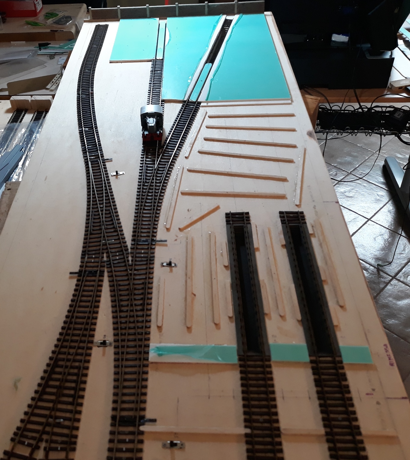 Il forex è verde per via della pellicola protettiva posta su un lato. Per i listelli... e relativa tecnica, leggi Listelli in legno economici - Fonte www.scalatt.it/forum Giusto, giusto che se serve "manutenzione", si tolgono. Nei due tratti di binario, "immersi" nella pavimentazione, ho scelto di avere un "solco controrotaia" abbondante, per evitare problemi di transito (visto prove con una nuovissima Gr 835 Rivarossi, che qui fa disperare).