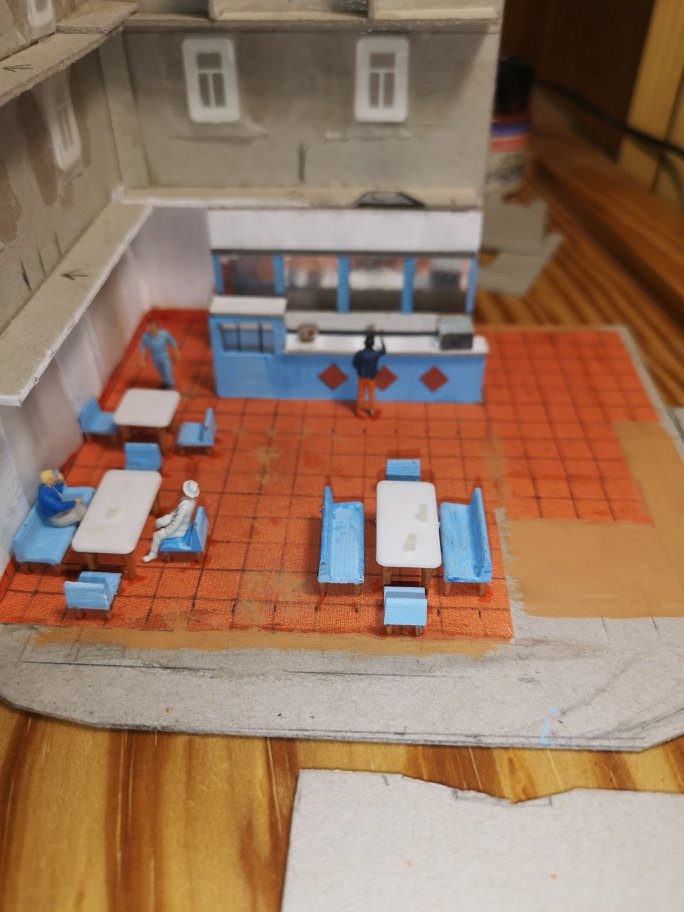 Intanto posto un paio di foto su un bar che verra posizionato vicino alla stazione, per il cui nome mi sono dovuto spremere non poco le meningi... "bar alla stazione" eheheheh ispirato ad una foto che ho trovato in rete con un arredamento anni 60 circa.... forse ho esagerato coi dettagli , sottolineo battiscopa e tende... in quanto una volta chiuso... benche illuminato... forse certi dettagli si faranno fatica a vedere...