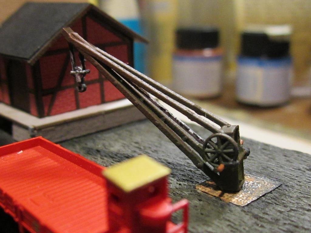Per la colorazione ho scelto un verde oliva dopo aver visionato vari filmati al posto del nero o grigio chiaro in modo che staccasse dal fondo, sempre tramite aerografo ho passato un velo di ruggine insistendo sulla parte superiore più esposta agli effetti meteorologici. I cavi sono stati prima dipinti in nero e poi illuminati con colore alluminio anche il gancio è stato trattato in tale modo. Anche le leve del argano sono state colorate per farle vedere, viste le dimensioni non ho insistito con i dettagli ma intervenendo su quelli visibili.