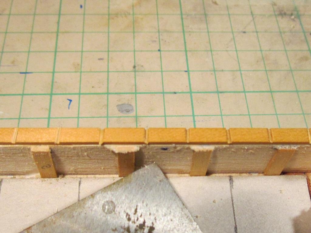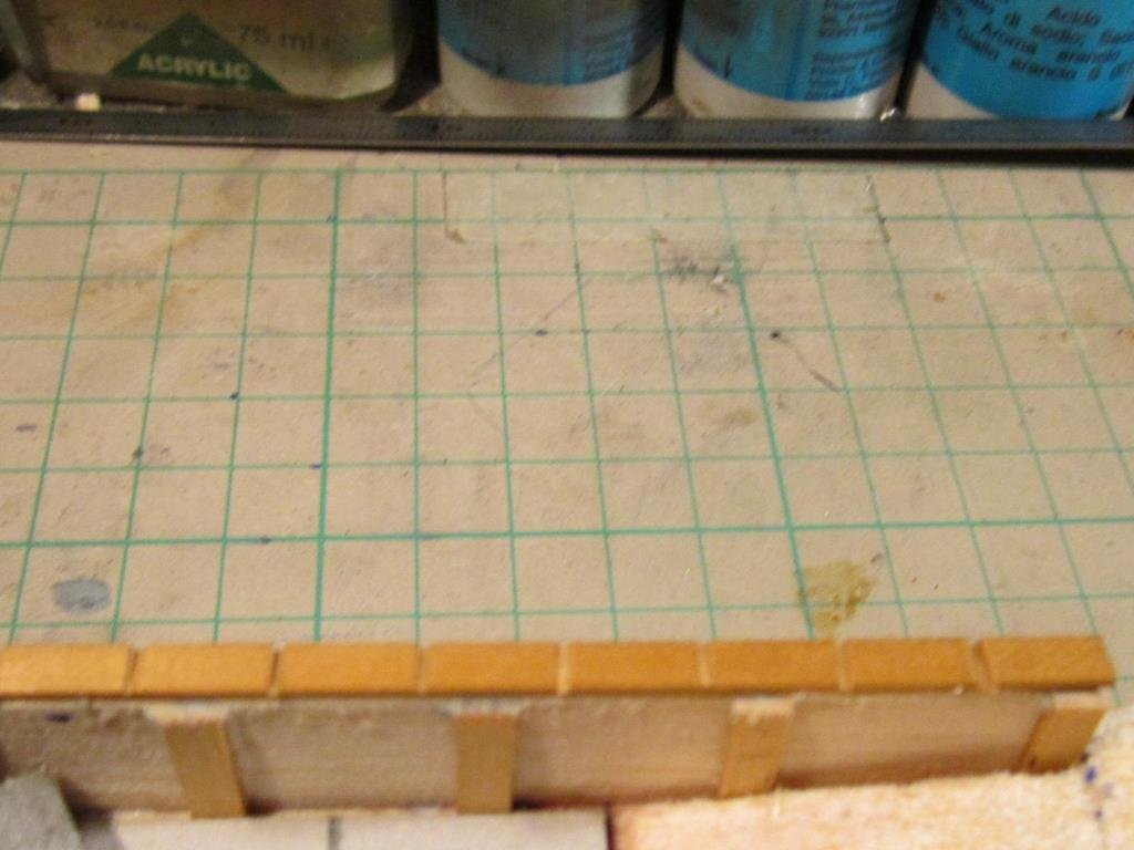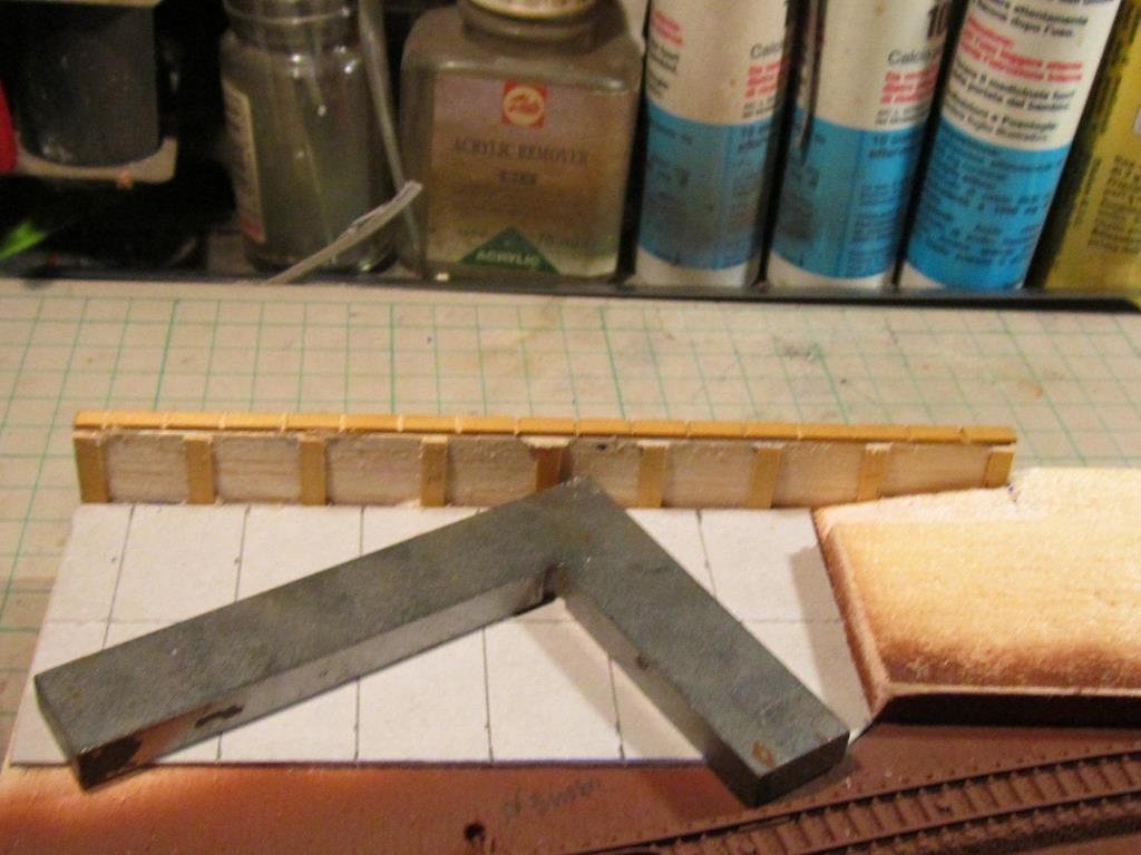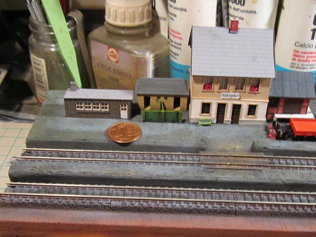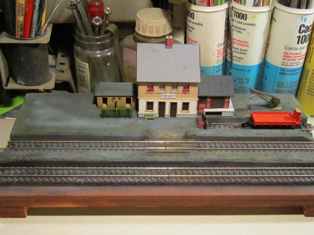 Per ora ho costruito il proseguimento del marciapiede principale, con uno scivolo per accedere al piazzale. Inoltre posizionato un muro divisorio e dato la prima mano di colore ai binari