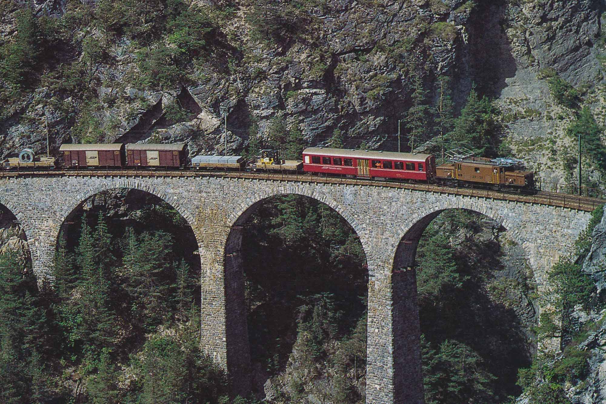 Il primo è un GmP (treno merci con servizio passeggeri) trainato della Ge 6/6 I, il famoso “coccodrillo” della Retica.
