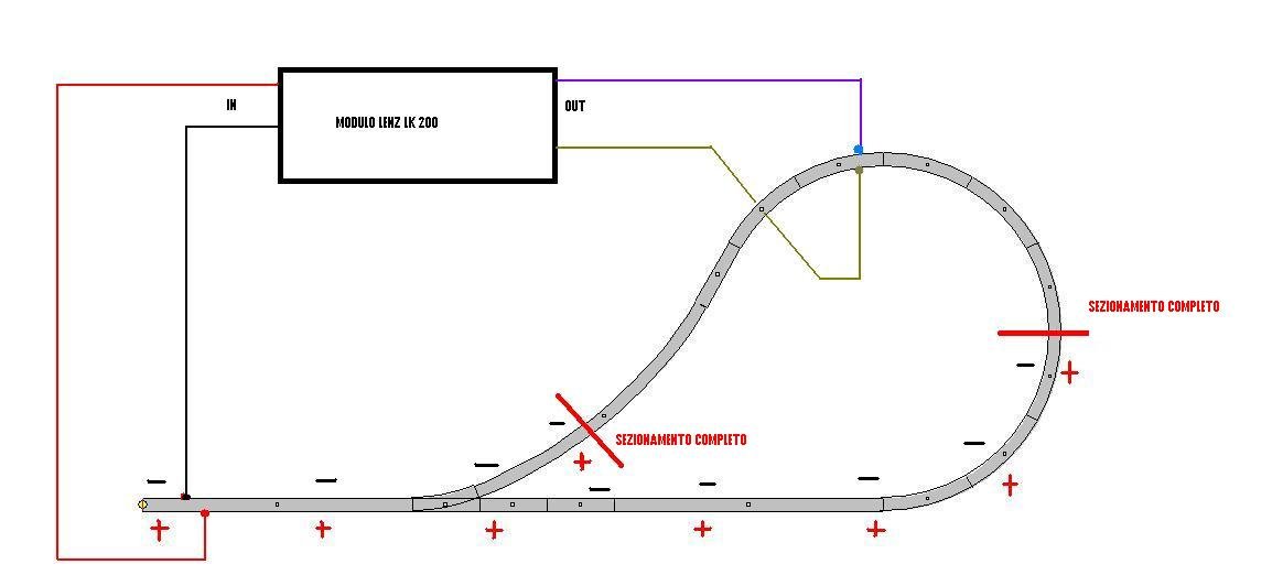 Gli altri deviatoi sulla destra non creano problemi a meno che dall'altra parte non ci sia un altro cappio di ritorno. In questo caso occorrerà un altro modulo LK200 per il secondo cappio.