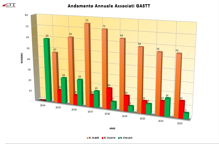 di seguito qualche grafico di andamento Iscritti all'Associazione GASTT per l'anno 2022 aggiornati alla data del 06 luglio 2022.