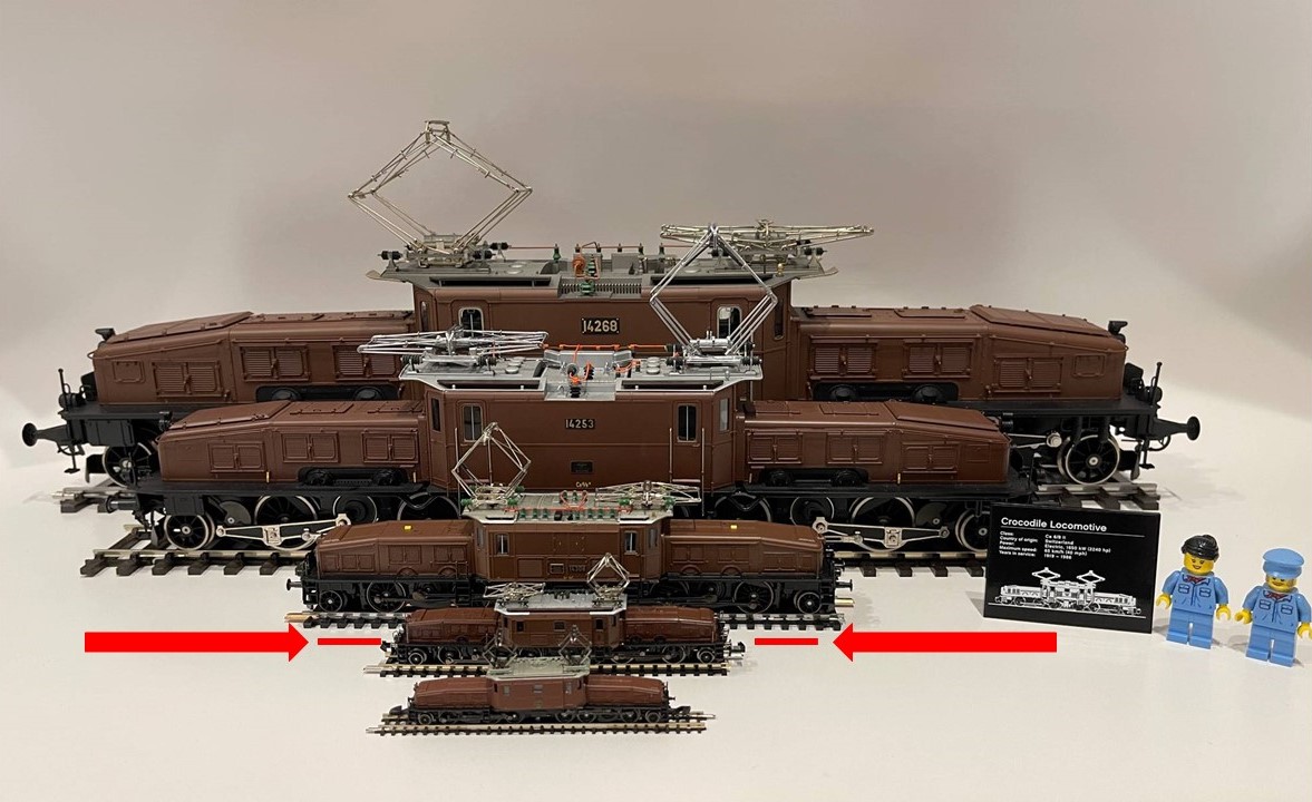 Per chi ci legge e con il prezioso aiuto della foto che il nostra amico ci ha fornito del suo interessante diorama, l'eventuale Ce 6/8 in scala 1:120, andrebbe ad inserirsi tra la seconda (scala N) e terza riproduzione (scala H0), partendo dalla più piccola scala Z.